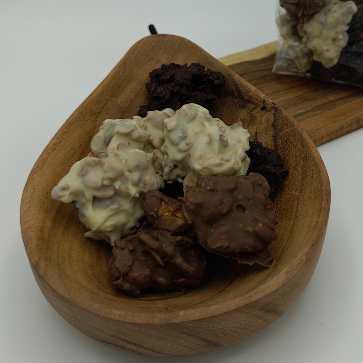 Rijk aan noten, smaakvol en moeilijk om te laten staan. Of je nu liever witte chocola, pure chocola of melk chocola hebt, BuurtBrood heeft het allemaal en jij kan kiezen welke smaak, of een zakje gemixte rotsjes.